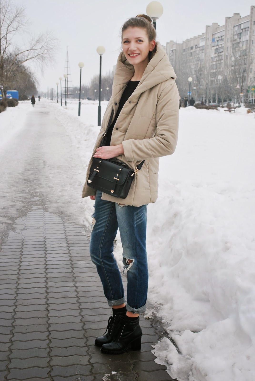 I'm so happy to write that it's finally getting warmer and warmer in Volgograd but here comes another problem: snow is turning streets into small lakes) Water is everywhere, so the main task now is to keep feet dry. Anyway, for me it's much better like this than it was during -20 freezing times)) To cheer myself up in grey winter day I decided to wear bright coat and my