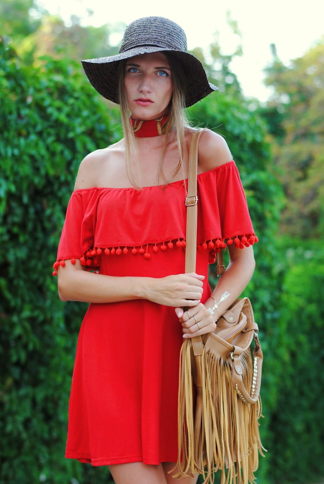 Привет, дорогие! Красный - это тот цвет, который всегда в тренде и идет всем без исключения. Не могу назвать его любимым, мне все же более по душе приглушенные оттенки. Но от этого платья от Style Moi я просто без ума! Прежде всего, меня радует фасон: модель off the shoulder сейчас на пике популярности! Дополнить столь яркое и броское платье я решила более спокойными, нейтральными аксессуарами: ультрамодными коричневыми сандалиями-гладиаторами от Choies и сумкой с бахромой от Banggood. Вообще я отметила для себя, что создать интересный и необычный образ летом куда сложнее, чем в другое время года. Виной тому жара, не дающая надеть на себя что-либо, помимо купальника или легкого сарафана. Поэтому, чтобы сделать наряд хоть капельку оригинальнее, я решила добавить широкополую соломенную шляпу и платок на шею. А как вам такой вариант?